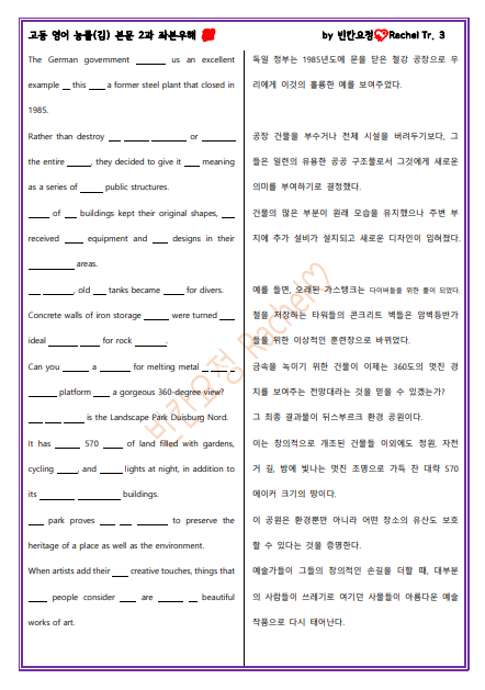 | 고등영어 능률(김) 1과 본문 전체 빈칸 문제 (0) | 2023.04.18 |