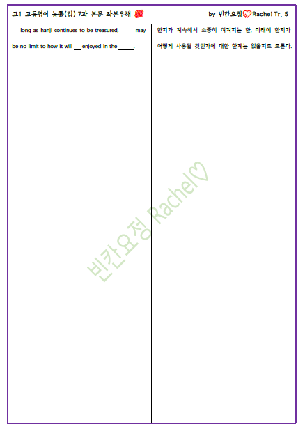 | 고1 영어 능률김 7과 본문 전체 빈칸문제 (0) | 2023.10.06 |