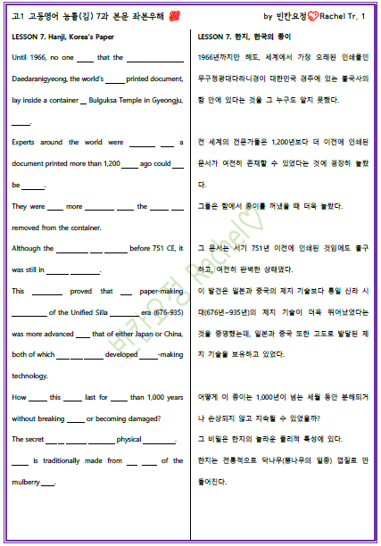 정답은 고1 영어 능률김 7과 본문 좌본우해 포스팅을 확인해 주세요 : )