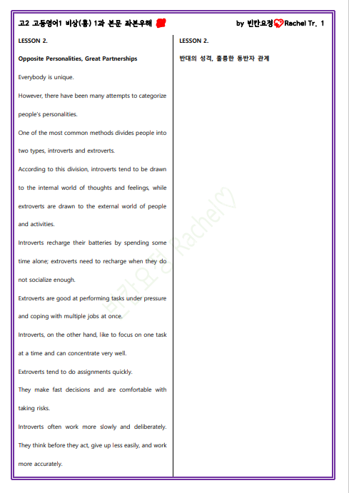 고2 고등영어1 비상(홍) 1과 본문 좌본우해(해석쓰기).pdf
