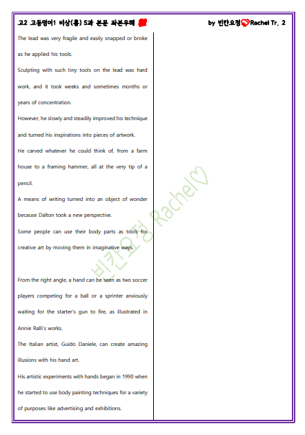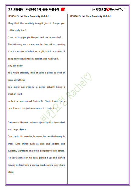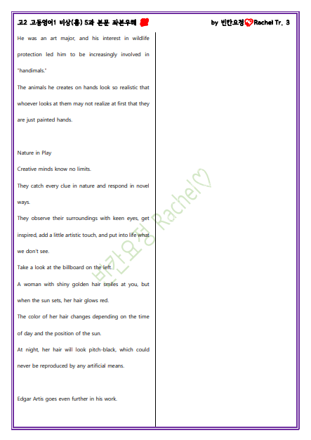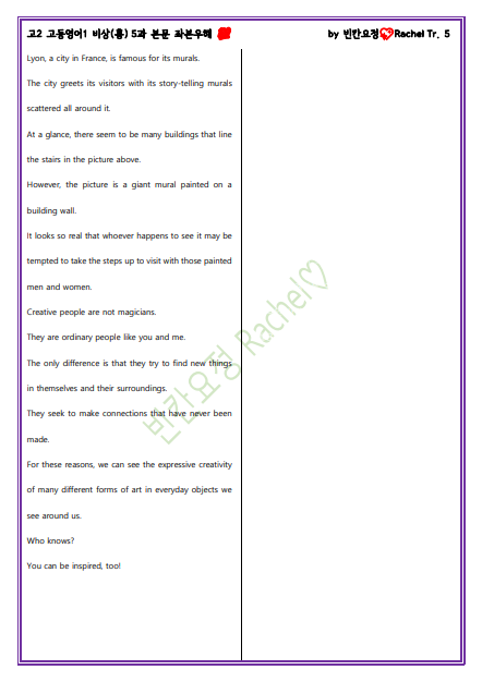 고2 고등영어1 비상(홍) 5과 본문 좌본우해_빈칸요정(해석쓰기).pdf