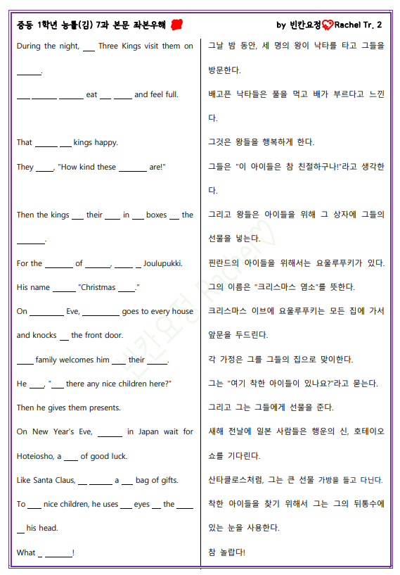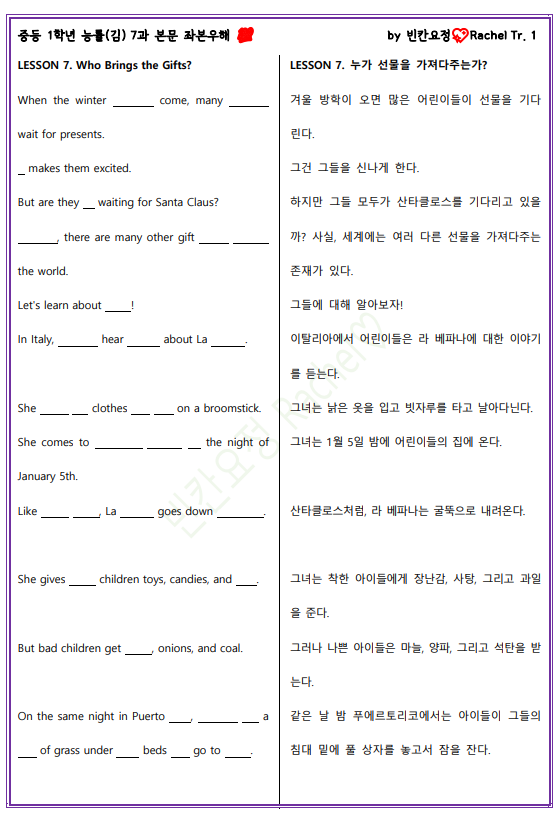 중1 능률김 7과 본문 빈칸문제(쉬운버전)