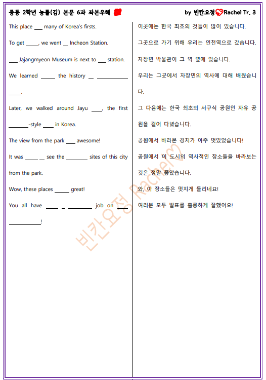 중2 능률김 6과 본문 빈칸문제(쉬운버전)