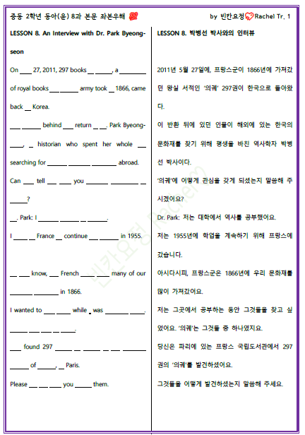 | 중2 동아윤 8과 본문 빈칸문제(쉬운버전) (1) | 2023.10.30 |