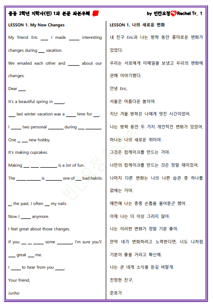 | 중2 지학사민 1과 본문 전체 빈칸문제 (0) | 2024.01.12 |