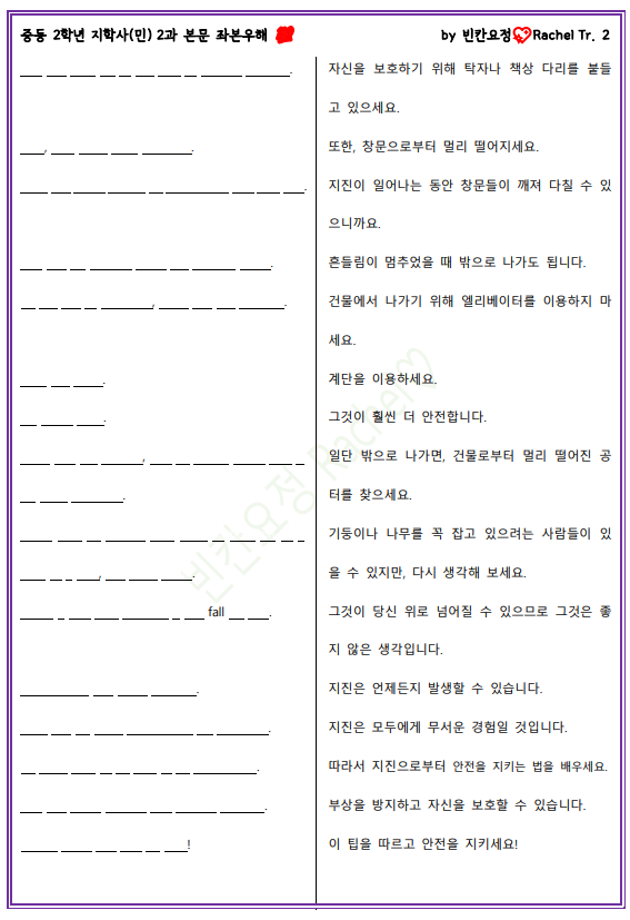 | 중2 지학사민 2과 본문 빈칸문제(쉬운버전) (0) | 2024.01.13 |