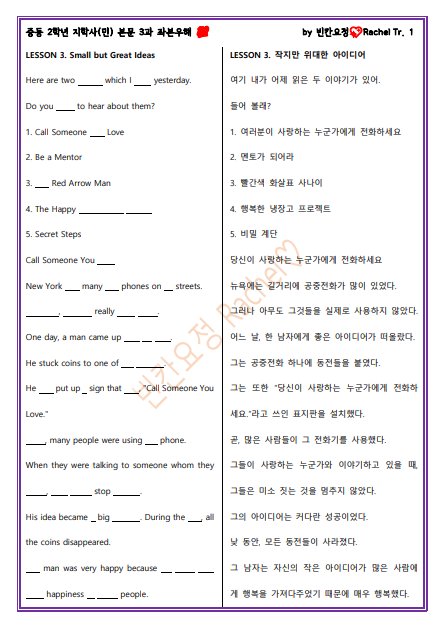 중2 지학사민 3과 본문 빈칸문제(쉬운버전)