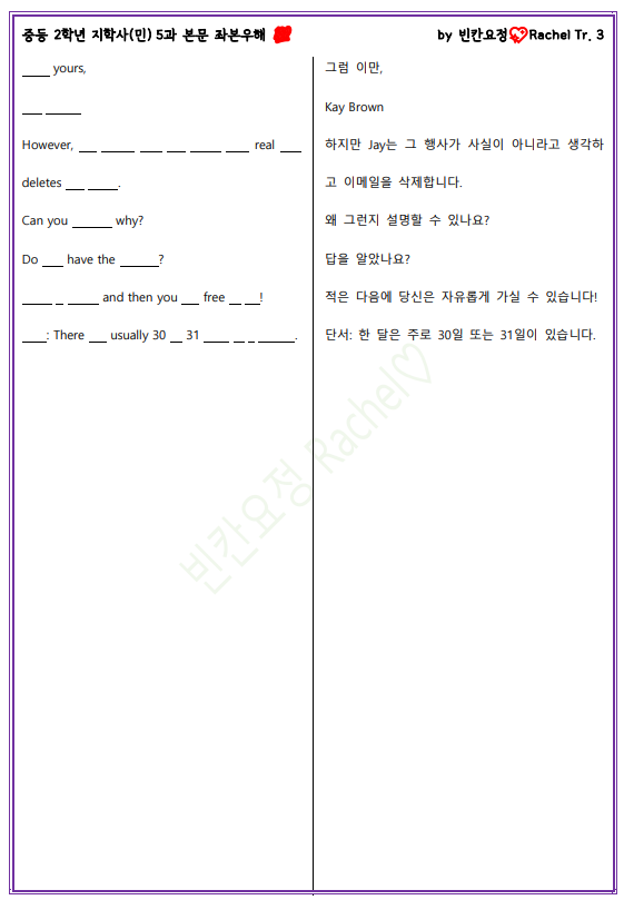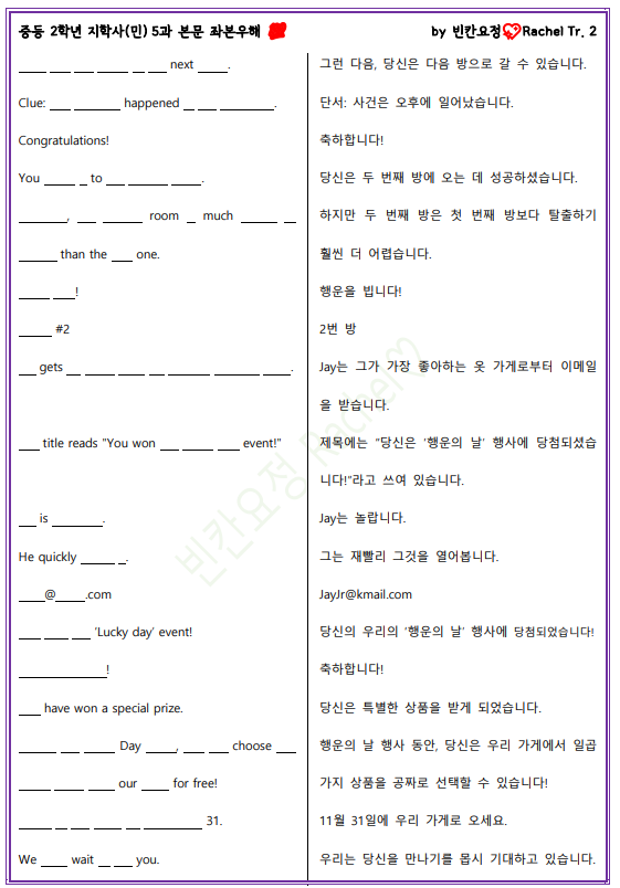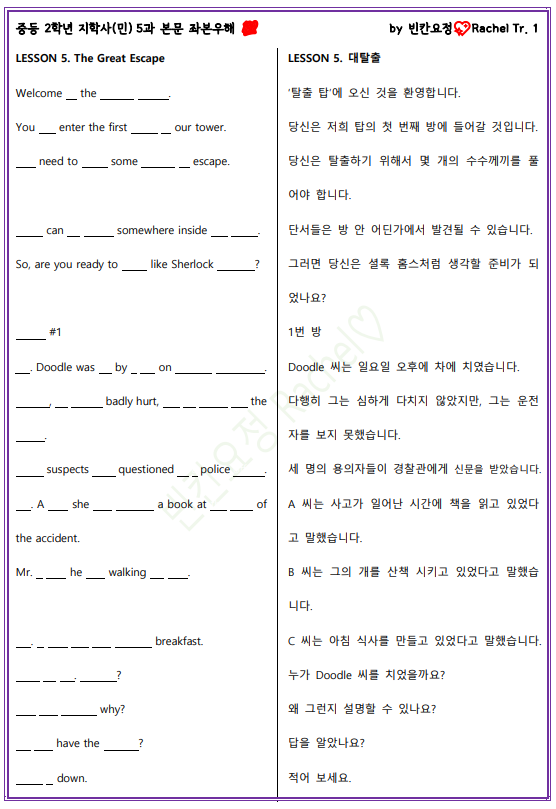 | 중2 지학사민 5과 본문 전체 빈칸문제 (0) | 2023.11.28 |