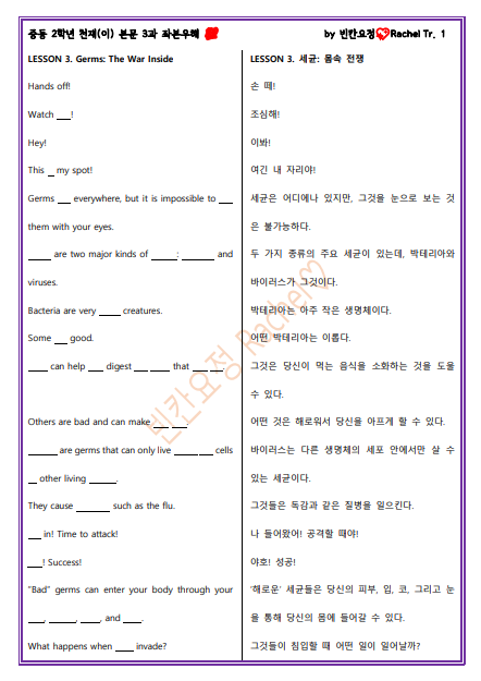 | 중2 천재이 3과 본문 전체 빈칸문제 (0) | 2023.05.14 |