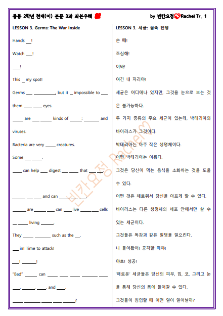 중2 천재이 3과 본문 빈칸문제(쉬운버전) (0) | 2023.05.14 |