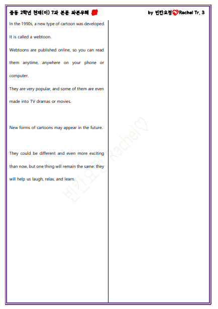 | 중2 천재이 7과 본문 전체 빈칸문제 (1) | 2023.11.24 |