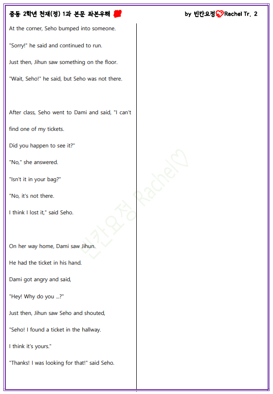 | 중2 천재정 2과 본문 빈칸문제(쉬운버전) (0) | 2024.02.21 |