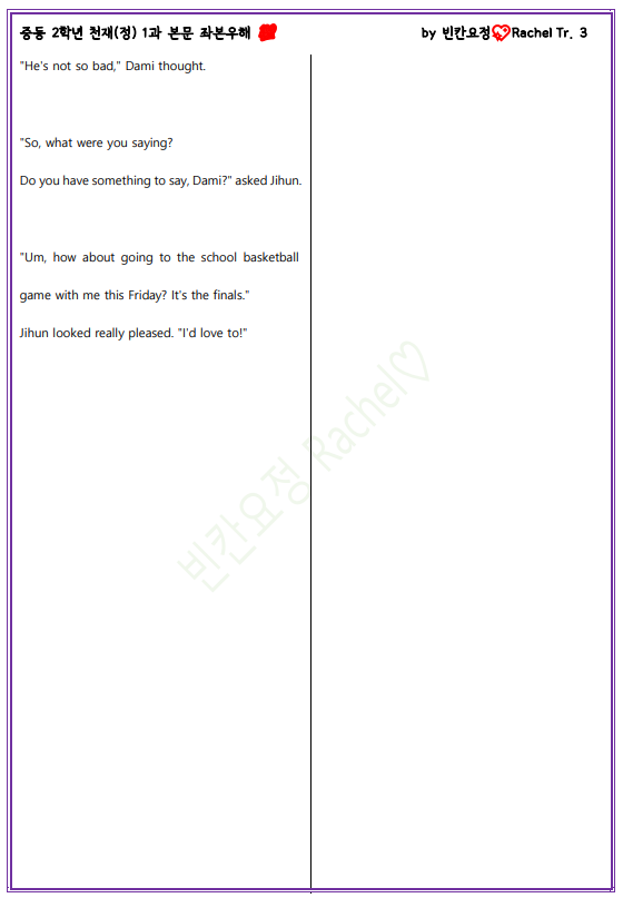 | 중2 천재정 1과 본문 빈칸문제(쉬운버전) (0) | 2024.02.20 |