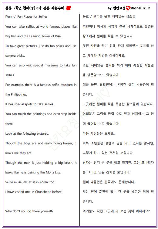 | 중2 천재정 2과 본문 전체 빈칸문제 (0) | 2024.02.21 |