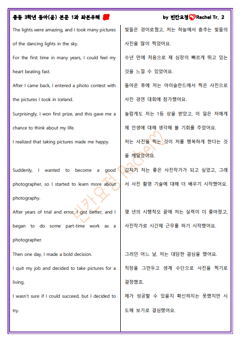 | 중3 동아(윤) 1과 본문 해석쓰기 자료 (0) | 2023.04.15 |
