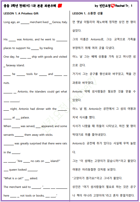 | 중3 천재이 1과 본문 전체 빈칸문제 (0) | 2024.02.02 |