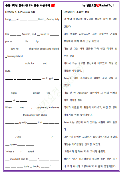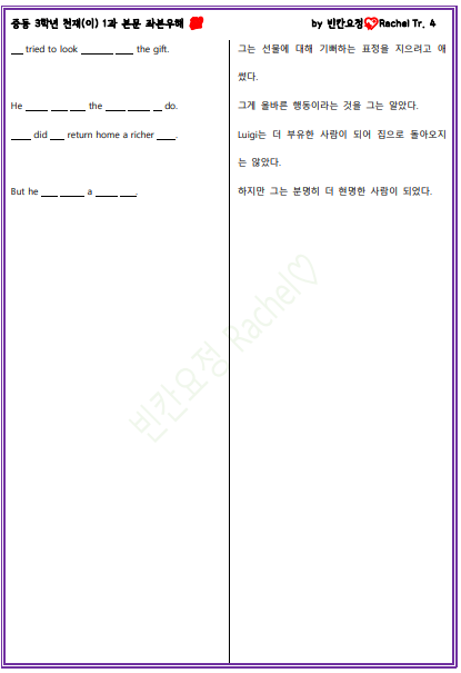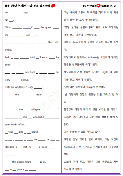 | 중3 천재이 1과 본문 빈칸문제(쉬운버전) (0) | 2024.02.02 |