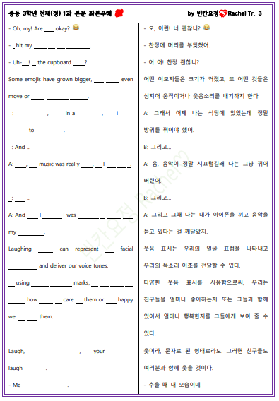 | 중3 천재정 1과 본문 전체 빈칸문제 (1) | 2024.01.18 |