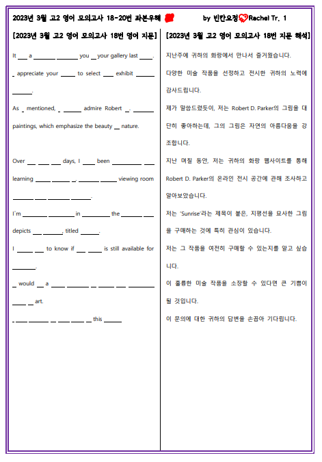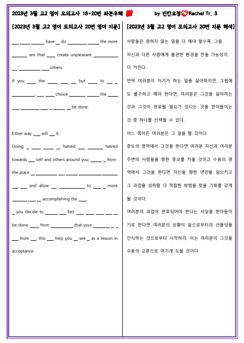 | 2023년 3월 고2 영어 모의고사 18-20번 해석쓰기 (0) | 2024.03.12 |